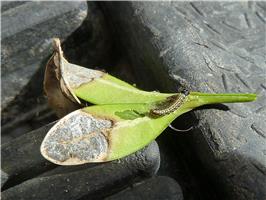Die kleinen Raupen von circa 4 Milimeter Körperlänge kommen aus den schützenden