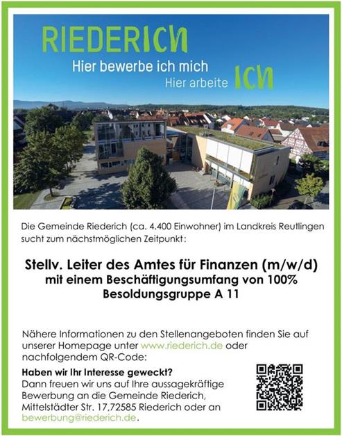 Die Gemeinde Riederich (ca. 4.400 Einwohner) im Landkreis Reutlingen sucht zum nächstmöglichen Zeitpunkt: